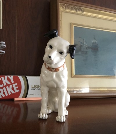 私の父は医師で、亡くなるまで住んでいた家のふかふかの絨毯が敷かれた書斎にはしっかりした脚の付いたステレオセットが設置されていました。ステレオが高価だからかどうか知りませんが、併せてこのニッパーくんを大小取り揃えておりました。物心ついた時からずーっと目にしていた置き物です。父が亡くなって引っ越しをした時期から、そう言えば見なくなりました。