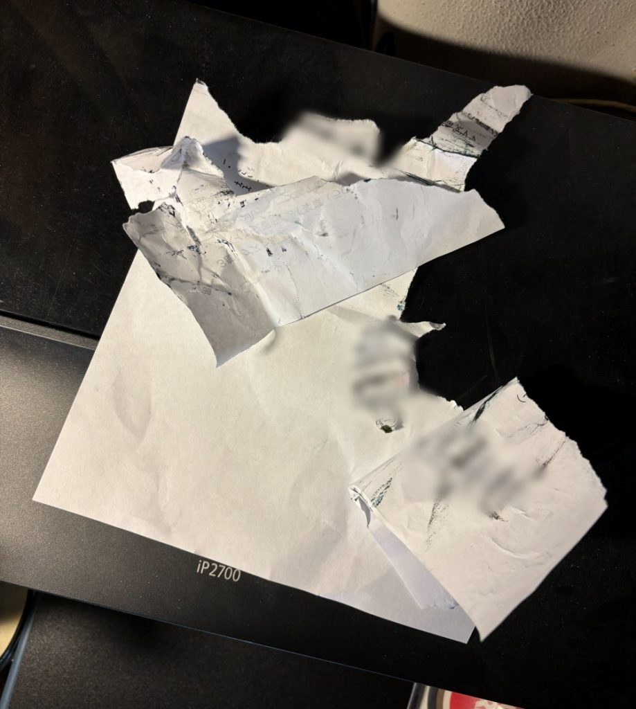 逃げたいところですがさすがにそうもいかず、プリンターの蓋を開けてつまった紙を引っこ抜く。